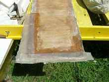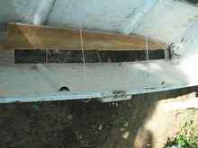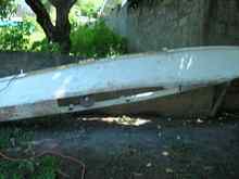 FIXING IT: Had a hole in the bottom of boat one. Evidently some rocks under the keel, hidden by sand; too many kids jumping on it, over too long a period of time. Cut out the bottom where it had the holes - see cutter above. Sanded both sides extensively - see same tool above.