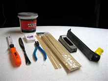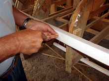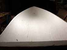 The foam boat pictures tell the whole story. The tools in the picture are all we used. Went to Lowes bought three sheets of 4 x 8 two inch thick Styrofoam for $12 each, ran them through the table saw two inches wide with a 3 degree bevel on both sides, tied them to the boat with dental floss, stuck them together with bamboo skewers, no glue, rough finished with a sureform plane and sandpaper and glassed it.