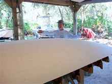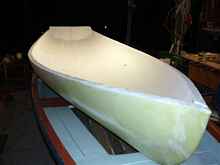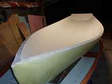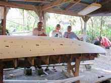 Three of us started this procedure at 10:15 in the morning and were finished "planking" at 3:00 in the afternoon, with lunch in there somewhere. It took me about an hour to fair it and Jose and I glassed it taking about 1.5 hours for each layer, it has 3 layers so far. That's it. We don't really know what we're doing, making it up as we go along, but it sure is fun. The two inch foam is firm enough to work with, it doesn't flex when you are working on it. You can sand the inside to any thickness you want. To see how easy it is to work with go get a foam cup and sand it.