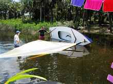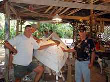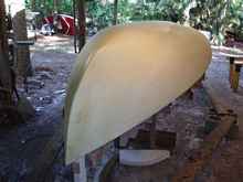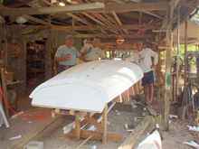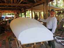 Jose and I lifted the glassed hull off of the mold easily, probably weights 60 pounds. I'll let you know how it works out, I'm sure it will be at Cedar Key in May. It was so much fun that Jose started one for himself, we already have the rigs for them so we can try them out without a whole new rig. You can see from Roger's expression what he thinks of it, actually he's as curious as I am how this will work out, some think it'll explode when I stress the hell out of it as I'm prone to do.