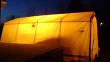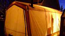 Assembling a 10ft x 20ft tarp car shelter poses the added challenge in the fact that it’s temporary so no concrete base or other nice arrangement. The best I could do was to bolt; strap and weigh the frame down and put in added security by strapping the new boat shed to the rear of the boat and the hitch of the trailer. It’s a good thing because all the other hold downs failed with exception of the trailer and boat rope bracing. Keeping warm is another challenge and I enlisted my father’s skills and he welded a sturdy little wood stove from a discarded hot water boiler.