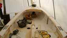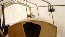 Please note that under no circumstances are you to put a wood stove in a tent or tarp shelter, however, I am “not all there” so had no hesitation with cutting a hole in the roof and putting in the woodstove. I only mention these things because it took a bit of time and thought as how I could do the necessary work and not loose time on the water this coming summer. It’s done and it works. The stove loves to consume wood but I get a warm 25C work space even with high winds and snow blowing under the walls.