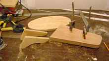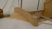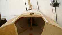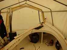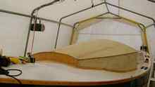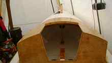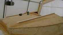 The first parts in were the fore and aft bulkheads screwed and epoxied in place with jig to maintain shape.