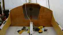 The cabin walls hanging out the back side were trimmed flush and a template was made for a new coaming that would run from cabin back to the transom, this time however I went with a substantially stronger piece of wood and I used ½” plywood.