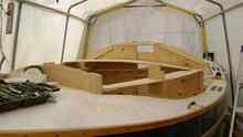 There were a couple of little surprises in this part of the project, frame #4 was not plumb (not really an issue when it’s just a rib, but can be when adding a wall) I had to leave a gap to later be filled so the wall would be vertical and cabin look proper. The cabin roof beam made of oak along with the compression post made for a very strong roof system along with the hatch frame. I have no issues with standing on this cabin. All that remains now is hatchway cutting, fillers, fillets, an eternity of sanding and finally painting and trim.