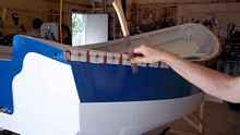 We used Meranti marine plywood, white oak for skegs and some small parts, soft maple for the stringers, and mahogany for the gunnels, and tiller. Strips of old growth fir were used to make the daggerboard.