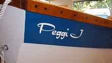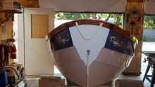 The white oak skegs, soft maple stringers and our sloppy epoxy no doubt contributed to the excess weight. We estimate that Peggi J weighs hull weighs close to 140 lb. This weight does not include the sail or spars nor the daggerboard and rudder-tiller assembly.
