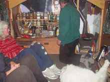 A kneeling galley, with wood-stove for heat and cooking, spans the forward end. All our day-to-day foodstuffs, spices and cooking gear are ready to hand, backed up by refill stores in 'deeper', hold storage. The port drawer (a glimpse can be seen in above photo) has a sliding 'bread-board' cover. It can be drawn out and used for additional counter-space.