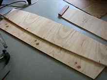 This was Michael's first attempt, per the plans, at kerfing the aft of the base panel. After attempting to bend it over the radius, he had to add new kerf cuts between the ones shown. Finally, he was able to achieve the bend, but not without much stress (on him and the plywood). |