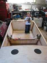 This is the finished boat, sitting on supports in the back yard. The flat sides and curved forward panels come together well, and the boat has a good working look to it, not an accident. With dry storage and ample under seat volume, Michael's family can enjoy a day on the water without the hassle of what to bring and where to store it.