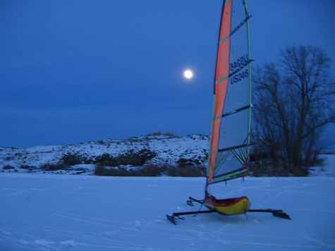 I roll in at 2 pm, there's an inch and a half of cold, dry powder atop 4 inches of smooth, hard ice. Wind out of the NE, 8 mph, running straight down the lake. Rig the boat, suit up, and I'm soon cruising around at 35 mph, carving great arcs on the pristine surface. Not a soul around, the last of the ice fishermen pulling off as I arrived.
