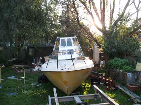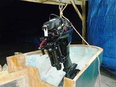 These pictures show what a long sleek hull my Helen Marie has. 26 feet long and 6-1/2 feet wide. And here she is with my Christmas present, a motor. This is a 20 hp Nissan long shaft, power tilt, electric start, remote control four stroke. The price of all this was $3200. This same motor without all the fancy stuff is only about $2400 but I need all the fancy stuff.