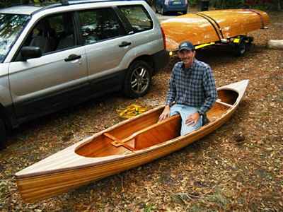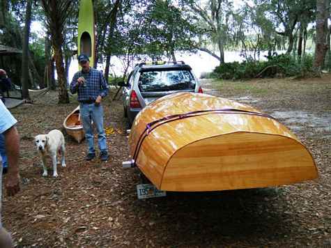 We were sitting around in the tiki hut reviewing the day with a few cool ones when who should show up pulling the most beautiful stripper I ever saw. This is an Iain Oughtred "Gannet" that a fanatically precise architect built. Steve got the unfinished hull, spars, c/b and rudder for, are you ready for this, $600 from Crags list. The workmanship on this hull is about the best I've seen, 3/8 cedar strips, even Barry Long would be impressed and I know he's another fanatic. Yes, Steve does have a wife. She must be a lot like Peter's wife. Both of these guys believe that every old boat deserves a good home and the boats seem to follow them home.