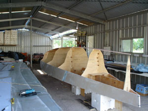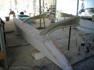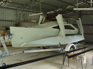 The boat I loved building is finished at last. It is on the trailer in the yard waiting for the weather to change so we can see if it floats. The kids are joking about us being flooded in saying we have the boat what's the problem. Ray Kendrick and I make up Team Scarab a business SE Queensland that sells boat plans. At present we have 9 trimaran designs aimed at the home builder. I usually occupy myself with the web site and book keeping but when Ray had to work away from home in order for us to survive I decided to build a boat. I had helped on other projects before but this was my first solo effort. Ray designed and fell in love with an 18 foot folding trimaran. I have developed an allergy to epoxy resin so I wanted to build the boat using foam and polyester resin. The boat is built using flat panels over a male plywood frame. The boat can also be built using plywood laminated panels.