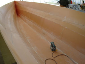 The foam was joined to the right length and glass was laid over the length. The resin was spread using a flat drywall spatula. We use peel ply over the resin to give a smooth finish to the laminated panel. The panels for the boat were cut out as you would for plywood joined to the frame with drywall screws and taped with fibre-glass tape. It was very quick to join all the panels. It was turned over and taped inside.