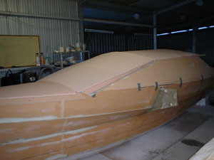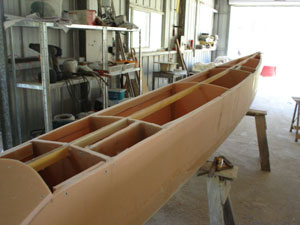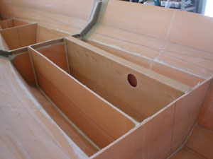 The bulkheads were added and support for the deck. The beams can be made using a mould that can be knocked up from plywood or form ply. Add the specified number of layers of glass.