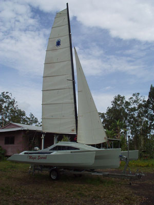 This will not be my last boat; I have the building bug. It's just trying to decide what I want to build next. This boat was built in less than 500 hours and it cost about $10,000 AUD without rig. We used a modified tornado catamaran rig and it should fly. It would have been less in plywood but the resale value of foam is higher.