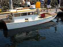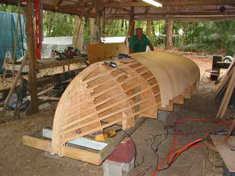 Here is a lesson in "cold molding" or better known as the "pulling out a million staples method of boat building". When Howard decided to build "Tricia Marie" the 20 foot melonseed he wanted to try something different so he cold molded her. When Mike Wick decided to build his melon "Moggie" he took the perfectly good hull I gave him and cold molded his boat on top of it. What you end up with is a super strong molded plywood boat. You can see from Tricia Marie that he set up the molds, put in a lot of stringers, cut up a bunch of 1/4 inch plywood strips and stapled them at an angle to the stringers. Next he took more plywood strips, glued and stapled them to the first layer using Titebond III waterproof glue. You can't leave the staples in the first layer or you can't get the finished hull off the mold so you have to pull them as you go. You can't pull them early cause that's what's holding the first strips to the mold. These plywood strips need to fit nice and snug to each other or you get gaps that weaken the hull. After the glue dries for the second layer you can pull all the staples at once, this is where you have a beer and staple party. Then you put on the third layer going another direction with more glue and a million more staples, (somewhere along the line he went out and bought an electric stapler). When that 's all dry you sand and fill and sand and fill and glass the whole thing. What a pain in the ass all this is, it takes a long time, lots of fitting together and the staples never end. When I built this same hull for my Helen Marie I used the same strongback, the same molds, added a few more stringers and had a strip planked hull. All done and glassed by myself in a week and no staples to pull. I'm glad he did one this way so we could see how it's done but I'm not sure it's any better than strip building, if you need more strength just add more glass.