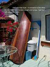 I've never built a boat; I seem to be attracted to bringing old junkers back to life. My latest is an odd one. It's a home built, of unknown and mysterious design: bow of a Adirondack Guideboat, middle of a freight canoe, stern of a Whitehall skiff. A very nice shape. Someone appears to have done a respectable - not expert - job of strip planking it like a canoe, and then smeared polyester resin all over it like paint. He must have been disappointed when it cured as rough as a corncob. OK, not that bad, but you get the idea. At least it sands off pretty easily. Oh, and it is a take- apart boat in two halves. By the time I'm done, I will probably be wishing that I'd built one from scratch instead.