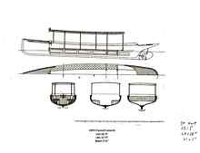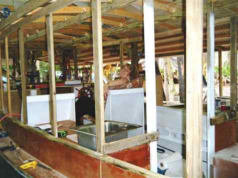 It's been a long hot summer and I've been under the weather but I'm back on the job. It takes a lot more work to design and build a boat, bedroom, kitchen, living room, engine room and back porch than it does a little sailboat but it is fun. I'll repeat the philosophy that's gone into designing this boat. I've had every kind of boat you can imagine, from small day sailors to large cruising boats, both sail and power and know exactly what I want. I want to be able to take the boat anywhere in the country at 70 miles an hour, cruise in perfect comfort for long periods of time at little expense and in all weather. Explore in all water depths with no thought of running aground, not worry about bugs or heat. Be almost indestructible so anyone can borrow it. Always be comfortable and self contained, ready to pull out and go at a moments notice on her trailer and have a happy wife there with me when she wants. As you can see, a lot of thought went into this boat. She's about like this 1899 fantail launch except she's 6 1/2 feet wide, which isn't much. This beam will make her very slick to push along, her 20 hp motor is more than enough. The entire concept is for two people living on her. More can go but the design is intended for two. She has a dedicated bedroom up forward, cabin with two large comfortable seats, a couch with refer and potty under, counter with sink, microwave, ice maker and air conditioner under. The 90 gallon water ballast should keep her steady and 250 range should eliminate worries about gas. I've included a few new pictures of the interior, window frames and A/C installation.