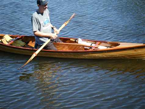 Without anyone onboard, she floats well above her designed waterline. At a displacement of 650 pounds, the waterline is from the turn in her stem to the turn in her transom.