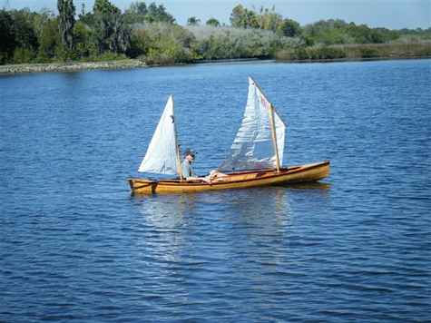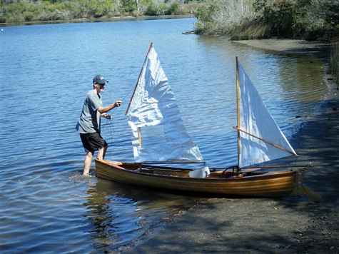 Here's the 12 foot long thirty pound schooner that Steve's been working on. A Wee Lassie. Not sure if it's really a schooner. The front mast is shorter than the back one but the sprit is taller. It actually sailed here in the river today and if you can make a boat move here it should be a winner in a real water place with real wind . He may be on to something here, a true car top sailboat.