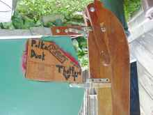 I ground out the below water shape of a sailboard's daggerboard using a belt sander on two layers of 4mm marine plywood epoxied together then fiberglassed & sanded a number of times. Here is it on the canoe ready for its next dunking.