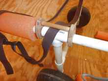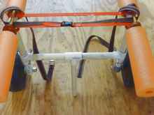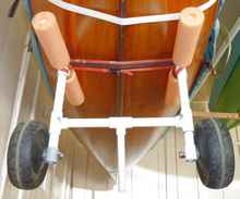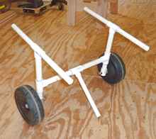 Next I found that the top of the unit spread apart due to boat weight, so I added a removable red strap between the upper T-connections to help keep the sides of the unit parallel. My single wheels tended to angle inward when the boat was loaded and the upper T-connections moved apart, at least given the dimensions of pipe, axle, and wheels that I used. Using a dual wheel set as shown in the original article might avoid these two problems. Any wheel used between the uprights (singly or as part of a set) would have to be shorter than the height of the horizontal kickstand pipe above the ground.