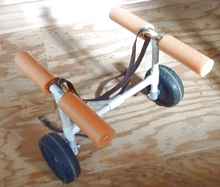 Having acquired a nice set of large, wide wheels from a discarded child's toy I recalled a trolley article that I liked. I built one with two changes: the kickstand which serves to hold the trolley upright while I load the boat, and the wooden fittings through which the tie down strap passes. As with the trolley featured in the previous article, this one comes apart for storage.