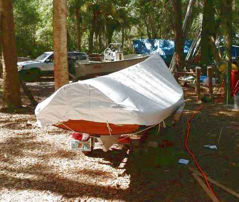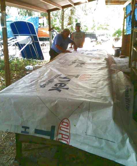Taking the Cortez Melonseed he made for his daughter up to Ohio next week so Steve showed him how to make a boat cover from Tyvek. This stuff is great. It's water proof but still breathes, is tough as nails and easy to work with. Took them about two hours to make this one. We all went in together and bought a whole roll of it from Lowes, it's good for lots of things.
