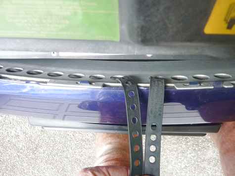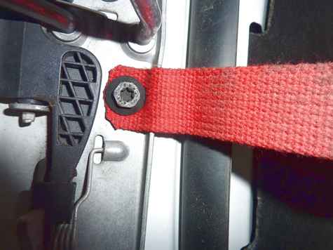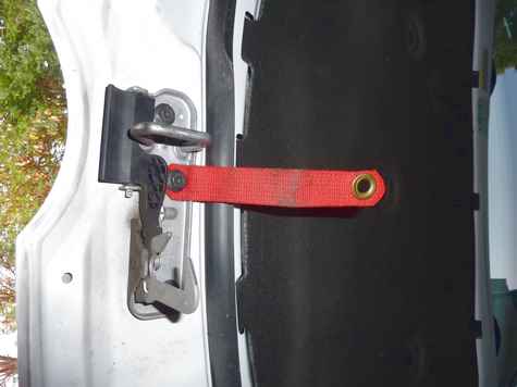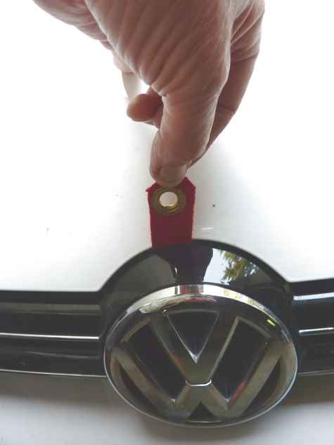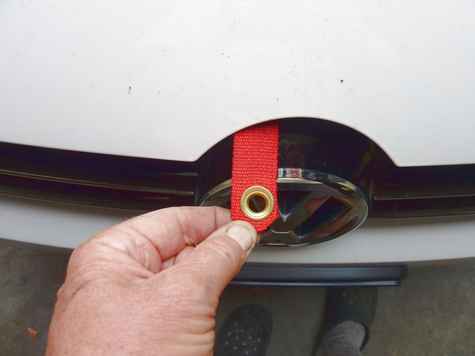 I carry an 18' Alden Ocean shell and a 13' peapod on the roofs of our two vehicles. A VW Golf TDI wagon and a MINI Cooper S. I suspect that each car model will require some creativity. Attached are my solutions. The MINI does have a removable towing eye but that attaches way off center. However it does have an very solid perforated aluminum panel just behind the grille so that's what I used to thread the rubber wrap n' strap through. For the TDI I just made a short piece of webbing with two grommets and attached it to one of the bolts that holds the hood latch mechanism on. When not in use, it just tucks in out of sight.