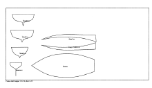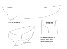 After these four cuts, put the wood in a vise deck down. Captain Nat used a draw knife to carve away the shape of the hull. Nowadays we use a plane for most of the carving away, then a chisel to chip away toward the keel until we can fit the templates on the hull to check our work. You can even line the inside of the template with fine grain sandpaper to sand the curve of the hull, saving some hand work and guessing . Just don't press on the template too much or it will grind more of the hull away than you want. Sanding wood is like getting a haircut -once you cut, it's hard to glue it back on. And painful, too.