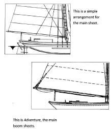 The plans for Adventure don't specify exactly how the sails are controlled. So we can be as refined or as simple as we like. On the booms sails had cringes, blocks, and a boom band to secure the sail. You can eliminate the clew block by running the sheet from the cringe through the boom or over its end to the boom cleat. My idea is to do things simply so that they look good; then once my skill level improves I come back to add historical details as long as I can do them well. I don't want to do a detail badly in order to be faithful to the period of the ship; I want to do what I can do well.