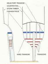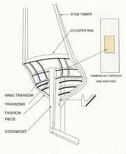 The wing transom is a horizontal members across the sternpost, near the top of the sternpost, reaching out to two fashion pieces. The purpose of the fashion piece is to extend the ship's planking from very narrow at the waterline to wide at the deck above the wing transom, what in small boats would be called a wineglass stern. The fashion piece was upright as the last frame but then an extension of it angled out behind the sternpost. This extension was called the counter. The joint between fashion piece and the counter could be a complicated angle, depending on the design. With good joinery, the pieces shoved into each other, but still at this angle the shipwright and loftsman were really earning their money.