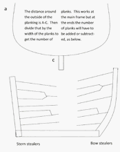 The number of rows of planks was calculated when the main frame was measured and stood up in place. It's outside dimension was divided by the width of the planks to get the number of planks. Now there was no standard width for planks; it just depended on what timber a shipwright could get. Often men would argue over who got the longest planks, and the owner or ship master would have to separate men and decide. The bow and stern outside frame measurement was always different from the main frame, so stealers were put in. They did not strengthen the planking; they simply gave the construction crew more joints with which to deal.