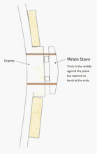 Before around 1750 planks were laid in wet sand and heated until they could bend. Then around 1768 kilns were built to steam-bend strakes. A section of thick ash tapered at the ends known as a stave was used as an outside clamp to keep the hot, bend plank in position until it could be bolted down. Kilns were wood framed, set on top of a brickwork base. The wood framed kiln would be 3 to 4 feet wide, 20 to 40 feet long. They had a door at each end. Steam from a boiler in the brickwork base circulated around the plank, one hour for every inch of thickness with an extra hour for good luck. A wale might need half a day in the kiln. Then men wearing gloves would bring the plank out of the kiln, carry it into place on the hull and clamp it down with the stave.