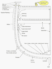 Ceiling planking was from keel upwards. Where the turn of the bilge was severe, planks called thickstuff were put in. They were 7 or 8 inches thick, 12 inches wide - big, strong planks to take the stress of the hull's turn. Up to the first deck, called the Orlop deck, the clamps and beam shelves took the greatest stress. These members made the ship stout. In some countries, orlop deck clamps were omitted to save weight. This tells us how heavy the orlop deck clamps were (orlop is the lowest deck). When a ship is fully planked, it is powerfully strong. Being sunk by enemy fire was less a threat than fire, an explosion or a dismasting. It was the boarding of a ship by pirates or a military enemy that made these great ships vulnerable.