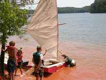 Since I had fore and aft airboxes, the Duck didn't sink, and I was able to swim around to the bottom and pull her upright with great ease, but she came up with a lot of water in her. Instead of climbing in and trying to sail, I had Steve Gully pull me to the dock with his inflatable.