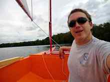 Sailing Solo for the first time. You might be able to tell that I am not steering in this picture. Serendipity on cruise control as I lounge. |