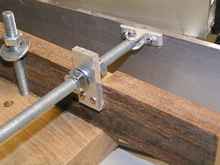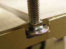 A good solid piece of oak was the best choice I had to hand for the jig base, the next problem was holding the jig to the table. Down the centre of the table is a slot for holding fittings and jigs. The usual method of fixing is by a lug with a threaded hole in it. I figured I could do better with two coach bolts with the side of their heads filed to fit the slot, the square head on the bolt would also help as a guide. A couple of holes through the wooden jig and the first problem is solved. Next we need a fence to hold the jig at the required angle, I would prefer to make it adjustable as then it can be used for other jobs.