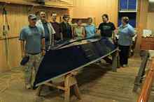 "Wooding" the mystery dinghy. Instructor Sean Kooman, third from right, leads the work. |