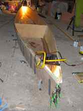 I probably could have removed the temporary frame at this point, but I decided it was safer to add the exterior glass first. ('m glad I did, because the gunwales did spring in noticeably when I removed the form.)