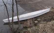 Then my brother joined me in the boat. His added weight brought our total to 450 lbs, and I don't think I'd want to go much higher in this boat, mostly due to cheap plywood and fragile construction. The hull form itself will probably take more load, since we had maybe 6" of freeboard to spare and it paddled easily enough. (Note that the polyester joints didn't complain at all!)