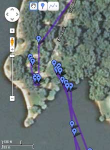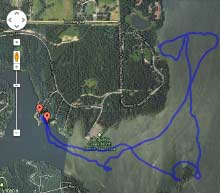 Note the elapsed time and speed fields at the far right. Useful stuff. We can also get summary information under “View – Reports”, but be careful! Mine showed a maximum speed of 16 mph, but looking at the track table I can see that this speedy number didn’t occur in the water! It was going through the campground on the way to the ramp. This, of course, also means that the average speed cannot be trusted, since it will include non-water travel time as well as time spent sitting still. My top water speed was only around 11 mph, which I knew from looking at the gps unit on the water. I used to get 16 mph, and I think this old, beat-up propeller isn’t moving water like it used to.