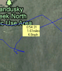 Second, this software will work with any map image, even with a scanned fishing map or topograpic hiker’s maps. You only need to be able to find points to calibrate to. I guess the best way to do this might be to find some clearly identifiable single-point locations on your map, then go to them and mark waypoints on your gps receiver. I suppose you could write down the coordinates too, but why not make the receiver do the remembering for you? Intersections and the ends of bridges are probably simplest. (I didn’t think to mark such points while I was at Rend Lake, so I can’t demonstrate this particular feature with this track.) Do however keep in mind the age of the map, as roads can be re-routed and shorelines can erode over time. If your map is correctly proportioned, two points will suffice. A third point will correct for stretch or skew in your scan, and a fourth will correct for any “fanning” distortion.