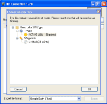 GPS Utility saves a .gpx file, but Google Maps wants to see a .kml file. This conversion can be accomplished by another piece of freeware – ITN Converter.