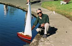 When my Starlet, still unnamed was complete, Roy presented it to me and added “It’s got all the bells and whistles’ to which I replied “That’s it Roy ! BELLS AND WHISTLES it will be !” With her tan gaff rig sails of Jeparra cotton she looked resplendent on the day that we officially launched her at Onepoto, and he had carved out of balsa and beautifully painted an Ancient Mariner helmsman with the name of Charlie Breeze which he insisted “even looks like you !”