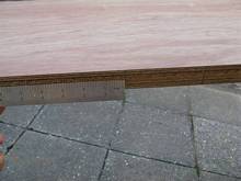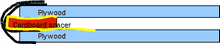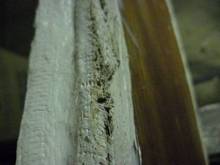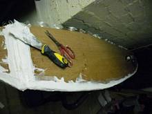 My next idea prompted by having the earlier joins to contend with was to use three thinner strips of cardboard and mount them stacked together which gave me exactly the height I needed in the joint. The thinner strips of cardboard were made in shorter lengths and were able to be added and joined end on end one at a time plus they were able to be bent to the slightly curved shape of the plywood panel quite easily. Unfortunately this had a slightly detrimental effect on how the join held together as the stresses of the joint tore directly out from the ends and the fibreglass/sikaflex blend peeled away from the edges.