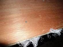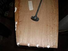 At this point I was just about ready to throw it in the water when I noticed two problems. Firstly, the two inch tape along the bottom was starting to pull free in a couple of places. Secondly, the place where the bottom had been sitting on the saw horse as I had been working on it had worn through. There were a few reasons - firstly, 2 inches was not wide enough, secondly, I did not leave the glue to cure for long enough before I placed stress on it, thirdly, I perhaps should have rounded the edges of the panels before I glued them together and fourthly, I may have been a little ham fisted in my handling of the boat, a pool noodle or towel on top of the saw horse would have helped prevent the wear through.