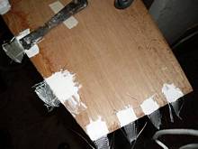 A short piece of fibreglass fabric half the width of the marks was then attached to the inside of the panels just to the right of the marks (remember we marked the insides of the panels with tape). Now when the panels are laid up next to each other the fibreglass should interlock.